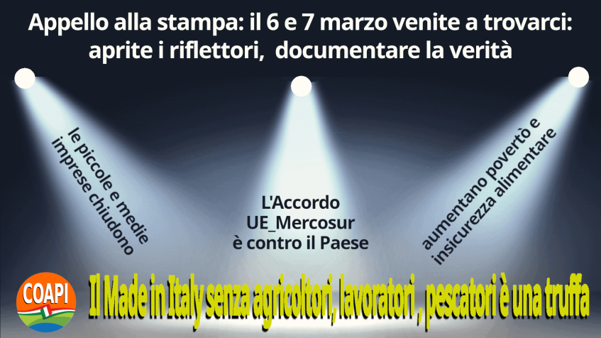 Quello che sta accadendo nell’agroalimentare ha bisogno di essere documentato e raccontato. Abbiamo bisogno che i cittadini e il Paese sappiano. Per questo invitiamo la stampa, gli operatori dei media ad essere con noi ed a documentare lo sviluppo delle iniziative che si terranno a Roma fra il 6 e il 7 marzo 2026.
