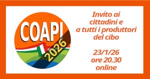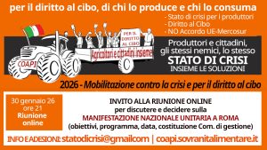 . Agricoltura. Pesca e Diritto al Cibo: Venerdì 30 gennaio l’incontro per organizzare la Manifestazione Nazionale Unitaria a Roma Scarica il documento di proposte per la manifestazione nazionale Scarica il documento sulle ragioni della mobilitazione 2026 29 Gennaio 2026 – Continuano le iniziative nel territorio del COAPI – Coordinamento Agricoltori e Pescatori Italiani ( fra …
